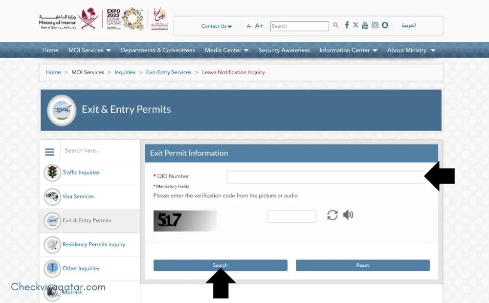 Visit the MOI Qatar website, go to Inquiries → Exit and Entry Permits, select Leave Notification Inquiry, enter your QID, fill the CAPTCHA, and click Search to view permit status.